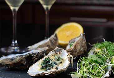 Ia alte două stridii, aranjează-le pe o tavă. Umple-le cu câte o jumătate de linugriță de celălalt amestec de unt. Topește-l un pic cu torță de bucătărie. Umple-le cu germeni de ceapă și presară coriandru proaspăt.